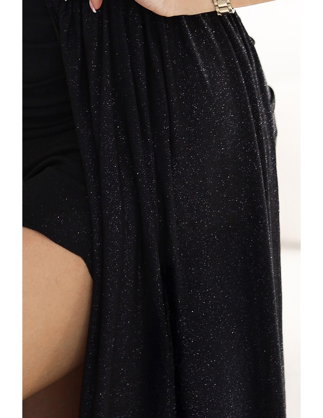 Juoda, blizganti maksi suknelė ant vieno peties su įspūdingu kirpimu ant kojos - elegancijos ir jausmingumo kvintesencija. Puikiai tinka vakarinėms išvykoms ir ypatingoms progoms. Lenkiškas gaminys. Numoco prekės ženklas.